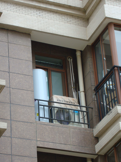 9、水箱裝好了,就該裝室外機了。就是通過這個室外機轉移空氣中的熱能來加熱水溫的。